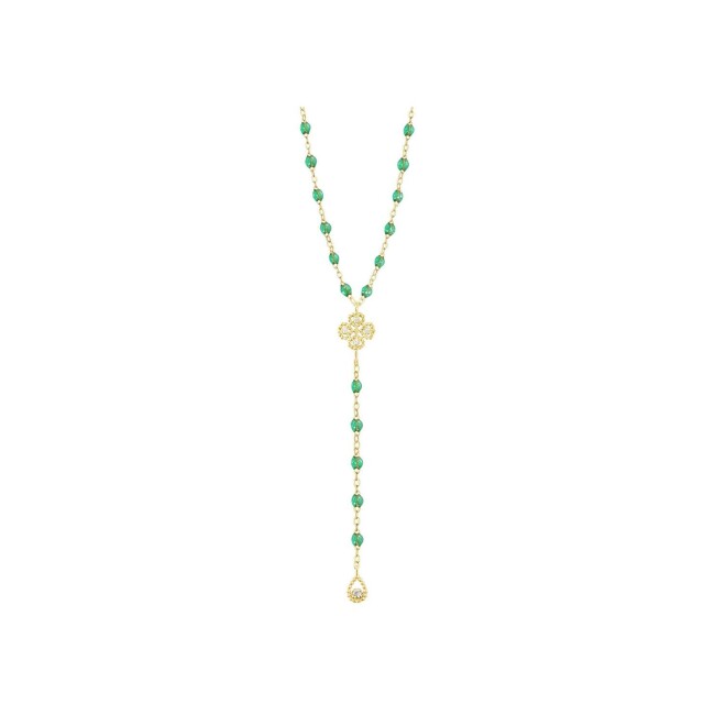 Chapelet Gigi Clozeau Lucky Trèfle en or jaune, résine menthe et diamants, taille 45cm