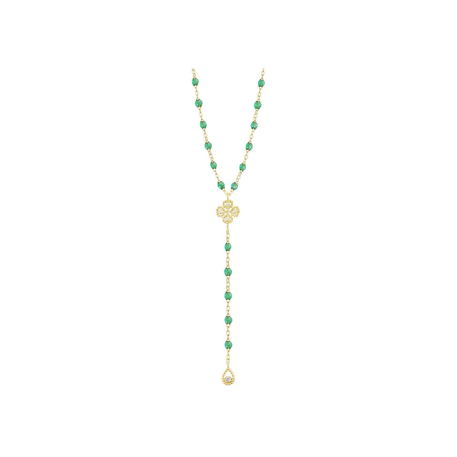 Chapelet Gigi Clozeau Lucky Trèfle en or jaune, résine menthe et diamants, taille 45cm