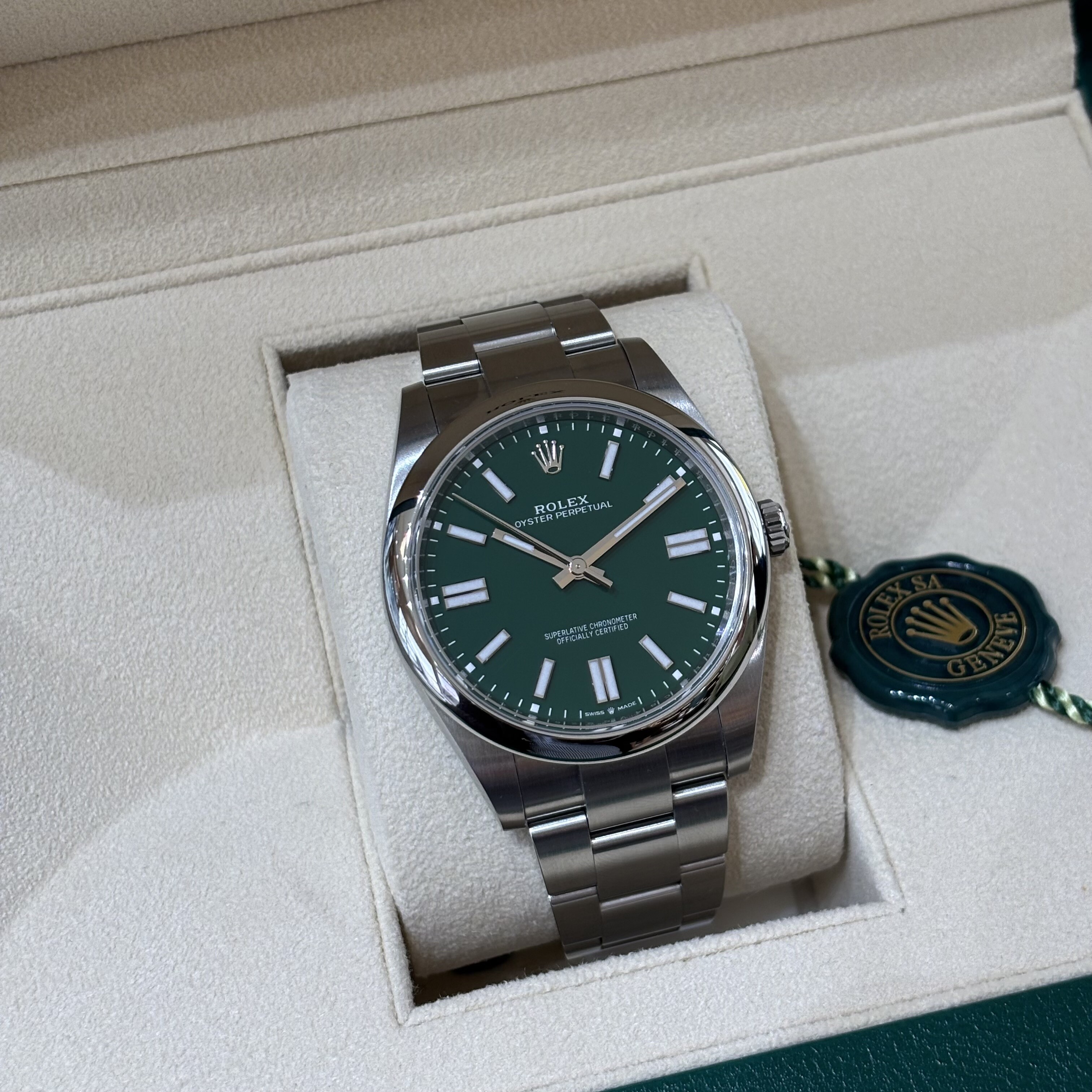 La Rolex Oyster Perpetual 41 green incarne l’essence même de l’horlogerie Rolex : pureté des lignes, équilibre parfait et fiabilité absolue. Cette pièce datée de 2024, proposée en excellent état, offre une opportunité rare d’acquérir un modèle recherché, apprécié pour sa sobriété contemporaine et son élégance intemporelle.